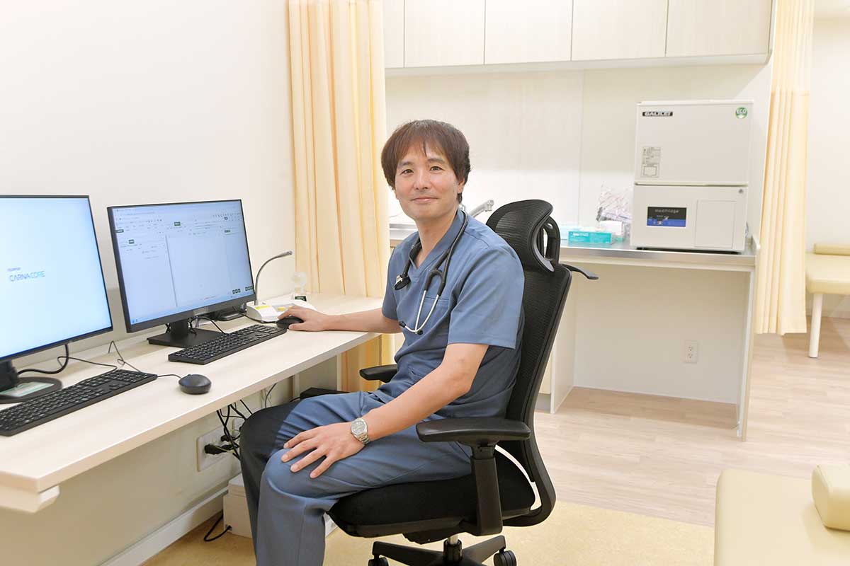 専門分野は内科、消化器内科ですが、一般的事項なら頭から足の先まで何にでも対応します。幅広い知識と診断能力が強みですので、診断の結果自分の範囲をこえた専門的な治療が必要と判断すれば速やかに適切な医療機関を紹介します。