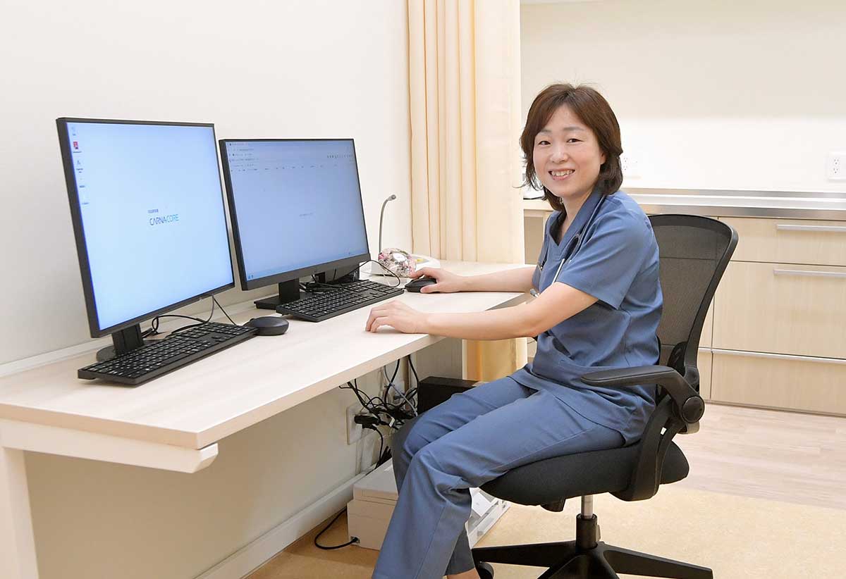 私は皆様の母親のような存在になりたいと思っています。気になることがあったら何でも話してみてください。身体丸ごと引き受けます。病気の早期発見、早期治療につながる健康診断(エコー、胃カメラ、大腸カメラ、レントゲンなど)、今ある病気はもちろんですが新たな病気にならないような予防教育にも力を入れていきます。年をとってもできるだけ元気に自分の家で長生きできるよう、地域で総合的な医療を行いながら行政とともに協力し、住みよい環境を整えていければいいなと思います。